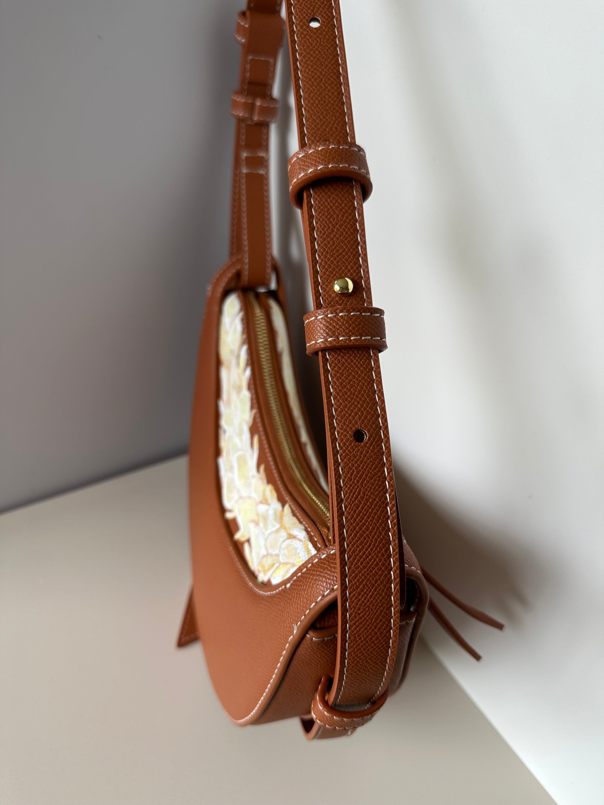 Thick faux leather, camel colored with gold accents. Adjustable belt-like strap, so bag can be worn at multiple lengths. Zipper tassel for easy access. Suede-like interior with card slot inside.