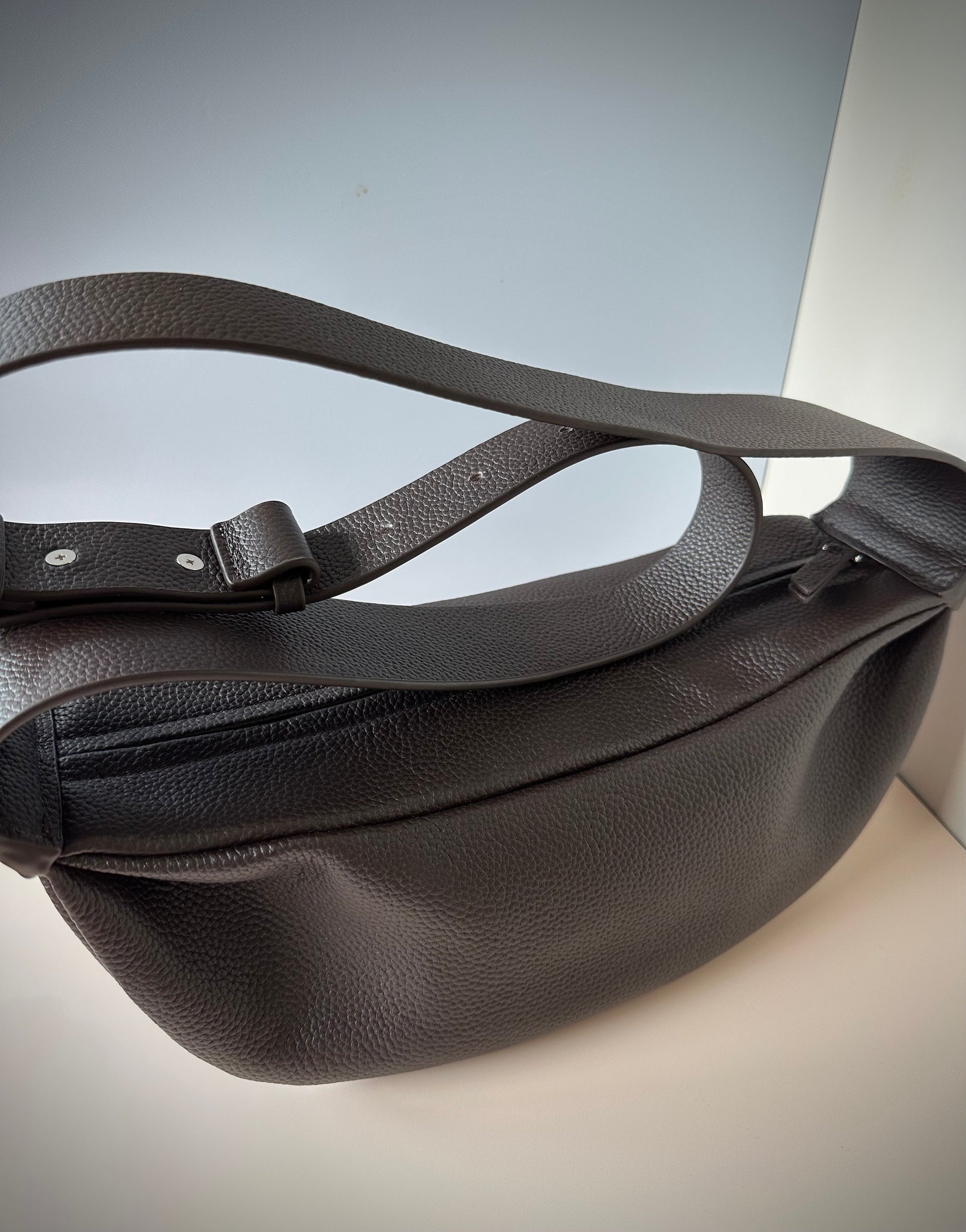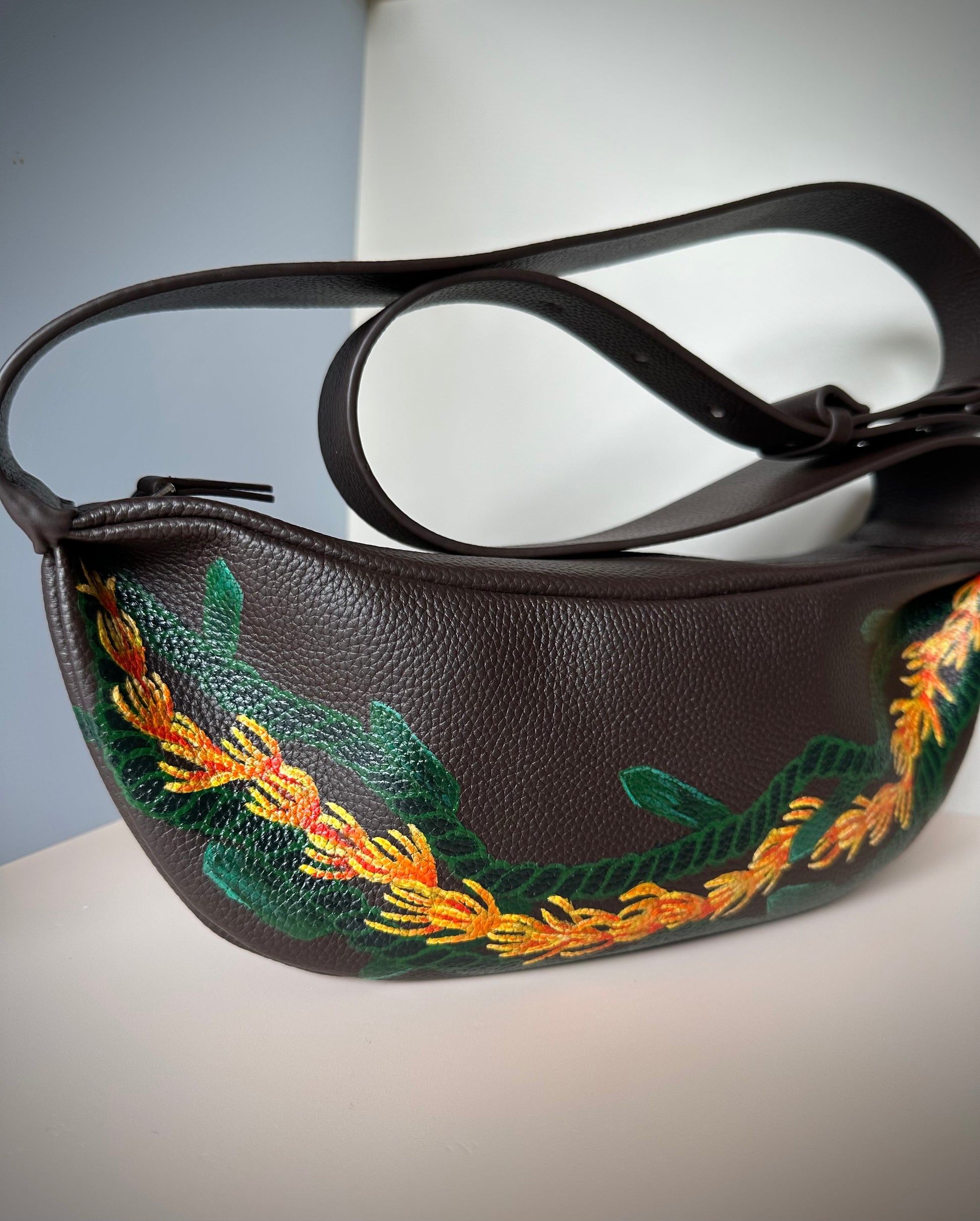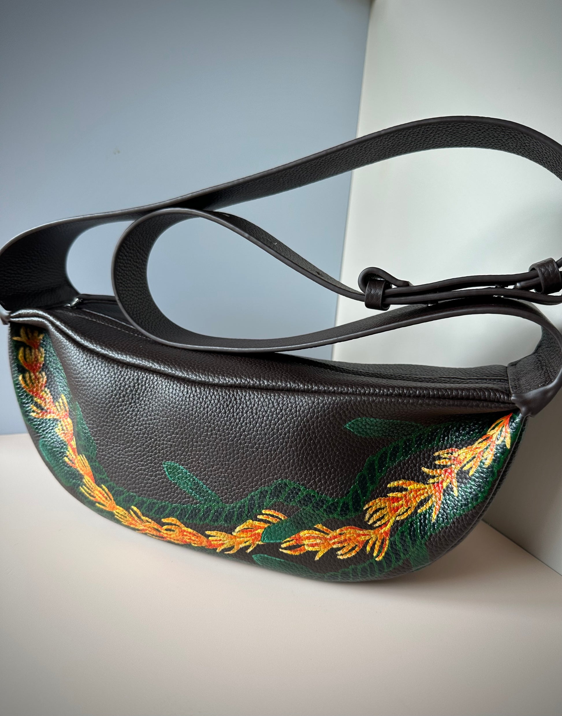 Espresso brown genuine leather. Can be worn on the shoulder or across the chest and has spacious carrying capacity. Adjustable wide strap for comfortable wear. Featuring Kukunaokala and Ti leaf lei. 11.81” L x 4.33” H x 3.54” W